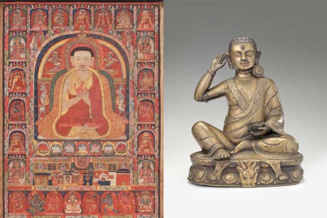 Artists in the Tibetan tradition strive to symbolize the wordless, nameless states of mind in multiple cosmic dimensions to aid in the quest to move beyond death and rebirth. In the center of the exhibition we once again meet Vajrabhairava, Destroyer of Death, and finally a serene 12th-century crowned Buddha, a visual metaphor for enlightenment, the state beyond death and rebirth.